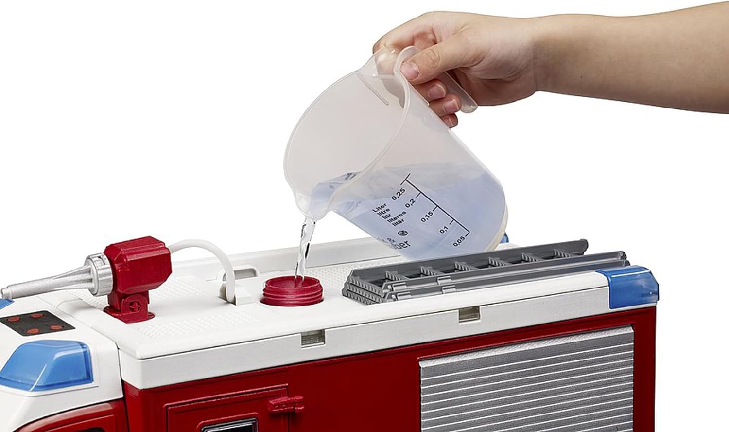 The BRUDER Mercedes Benz Fire engine is a true multifunctional device for rescue operations. The crew cab can accommodate up to 4 bworld firefighters. The fully functional water cannon with water tank and pump extinguishes any source of fire in no time. There is also a second hose for further extinguishing operations.