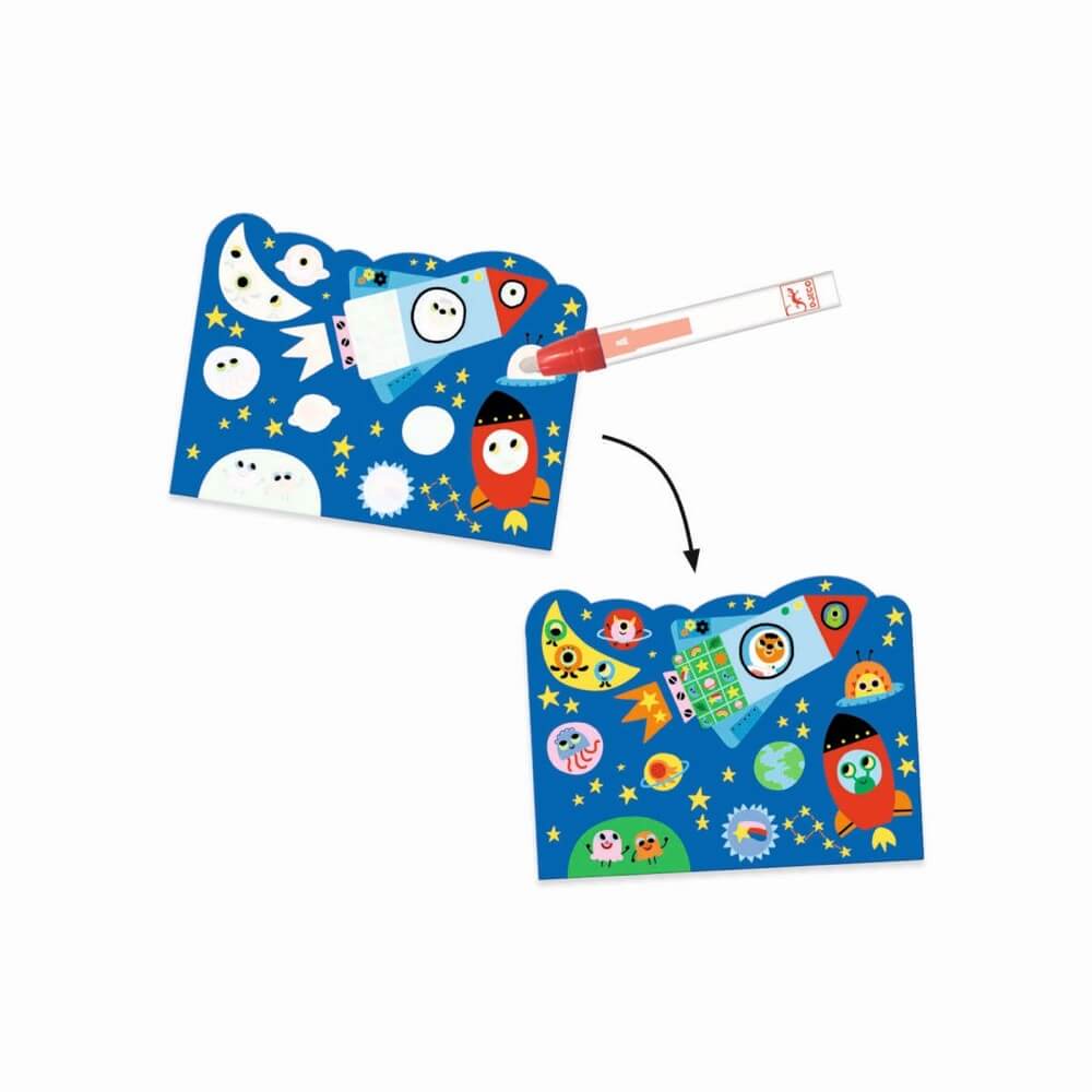 Explore the skies with this adorable colouring set. Introduce colouring in a safe, no mess and easy way. Fill the pen with water, then start colouring to reveal all sorts of surprises. When it's dry, they can start again, indefinitely! Great for travel, eating out and on the go. Contains 4 sheets to colour and 1 water fill pen. 18+ months.