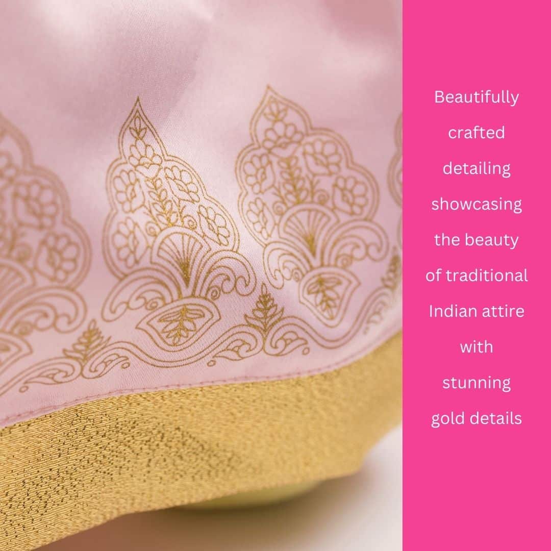 Kamala is lovingly designed to honor Indian tradition. She wears a vibrant purple lehenga with intricate gold embroidery, paired with a flowing pink dupatta. Her hair is styled in a traditional braid, and shimmering gold shoes complete her look — every detail reflecting the beauty of Indian culture.