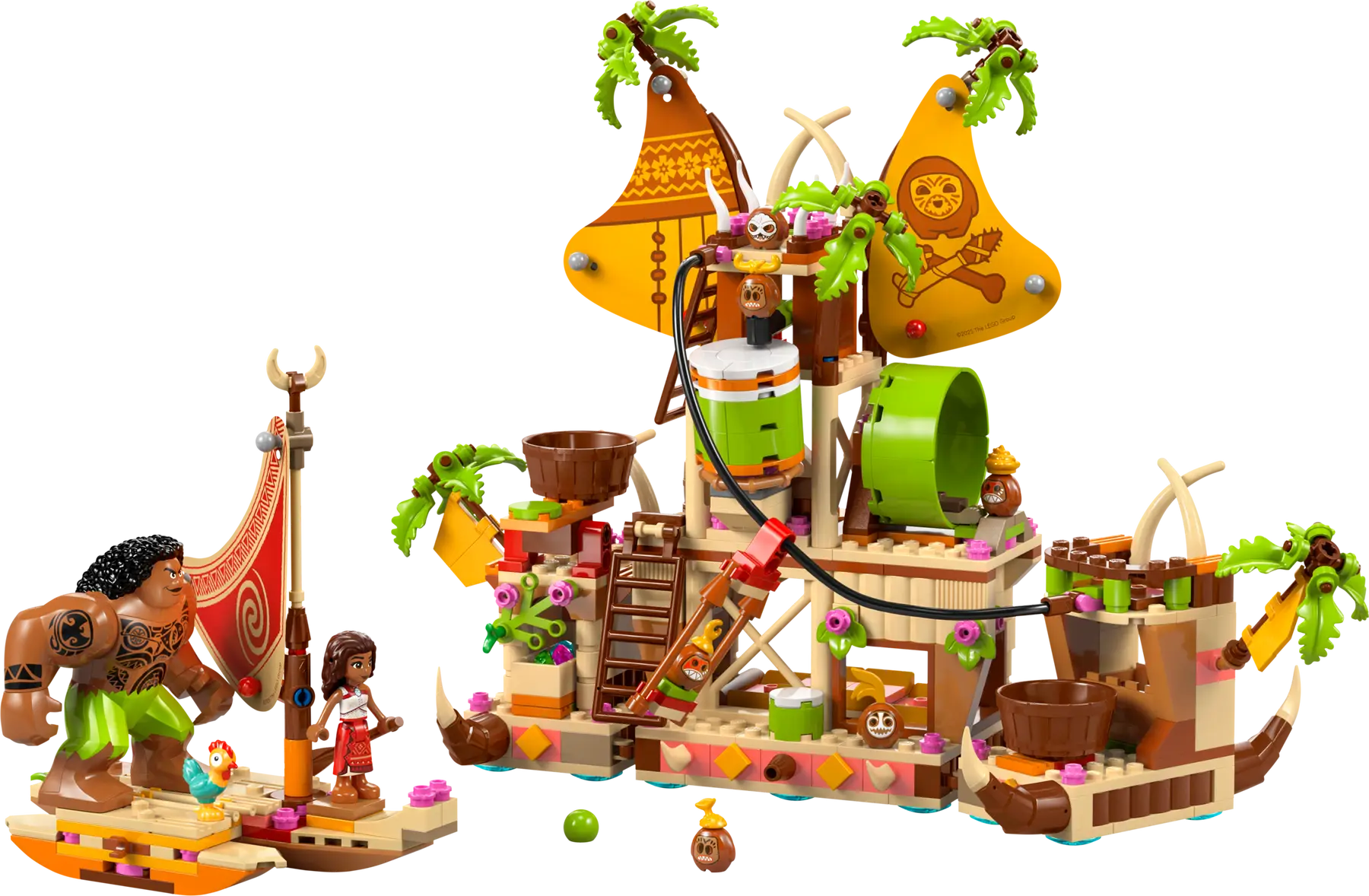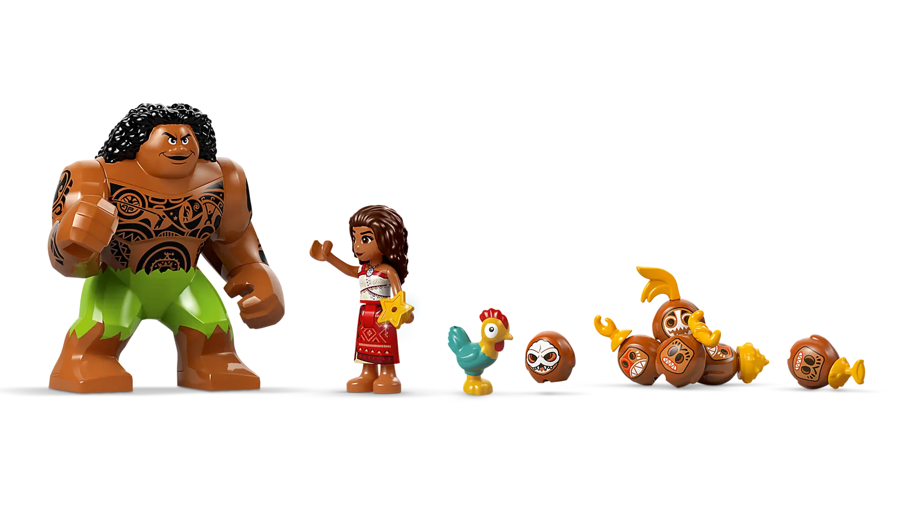 - Moana boat building set – Includes a barge boat with 3sections and a zipline, a smaller, 2-hulled canoe with storage space, Heihei the chicken, Moana, Maui, Kotu and 5 more LEGO® ǀ Disney characters