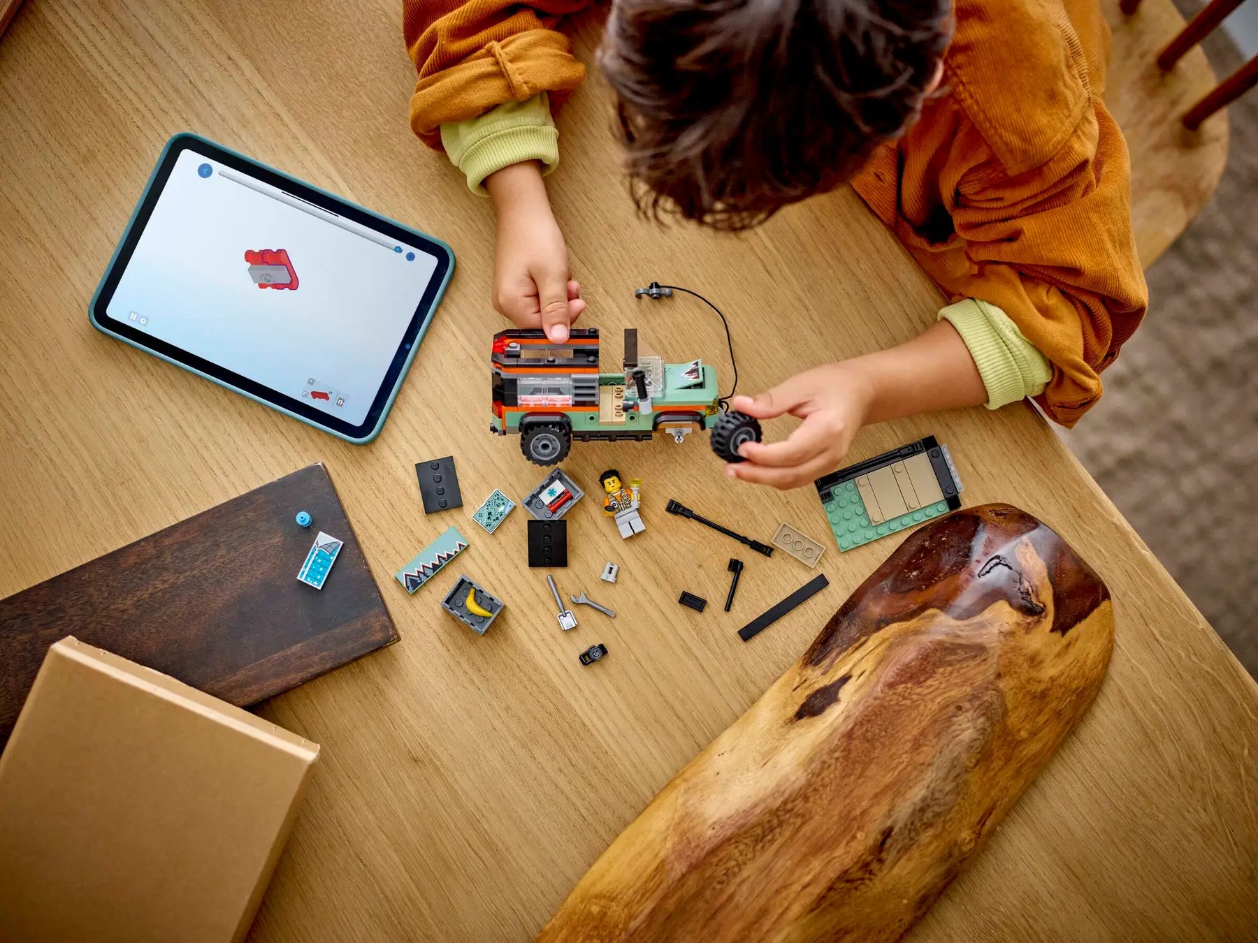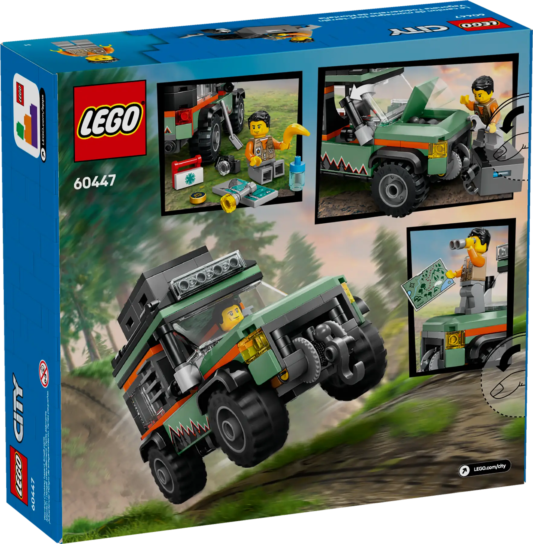 - Vehicle set packed with LEGO® minifigure accessories – Includes a toy camera, water bottle, flashlight, map, compass, binoculars, tools and a first aid kit for pretend play