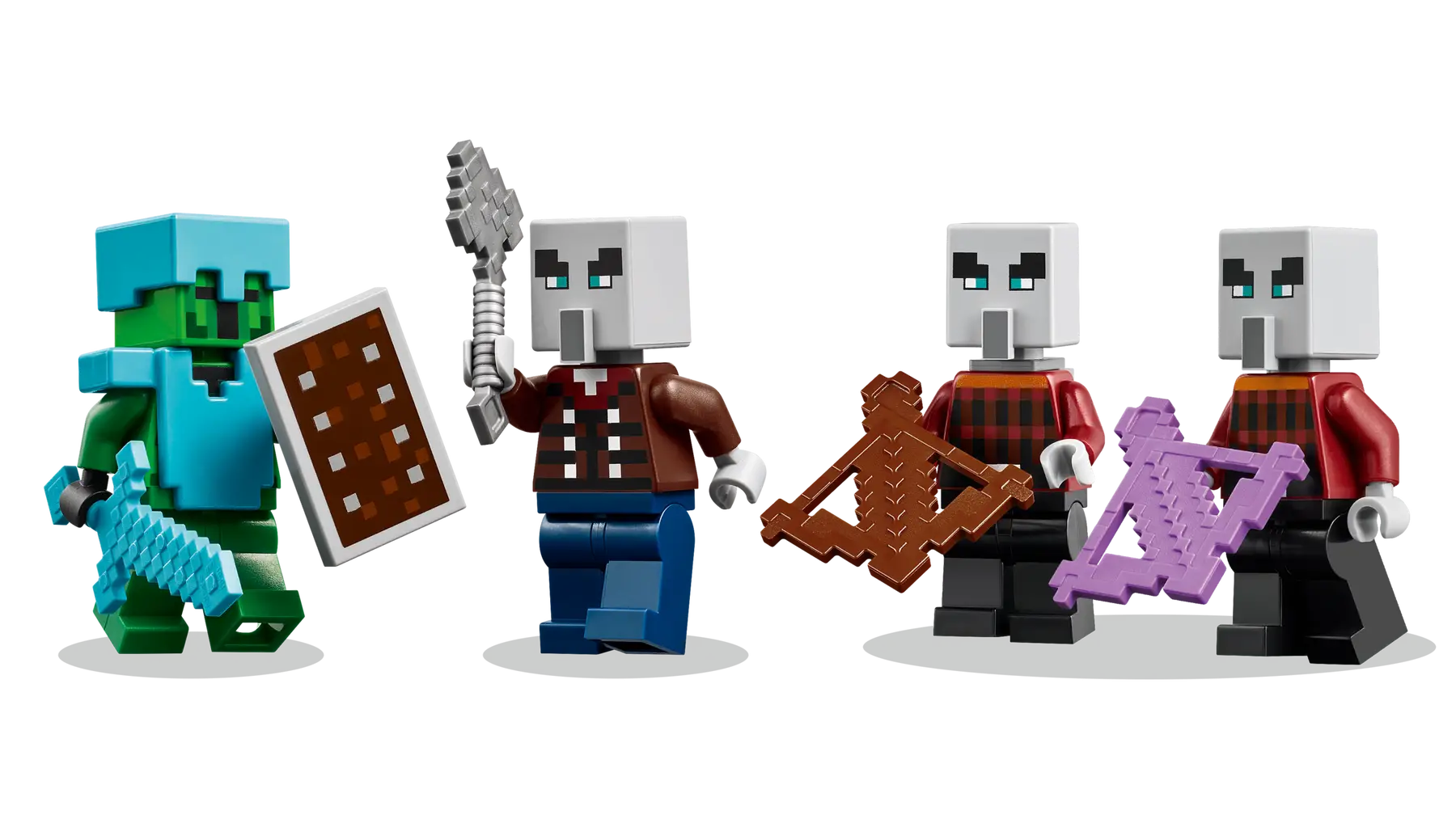 - 4 Minecraft® figures – Includes 3 illagers, 1 hero character and a variety ofauthentic accessories, including a diamond sword, shield and armor