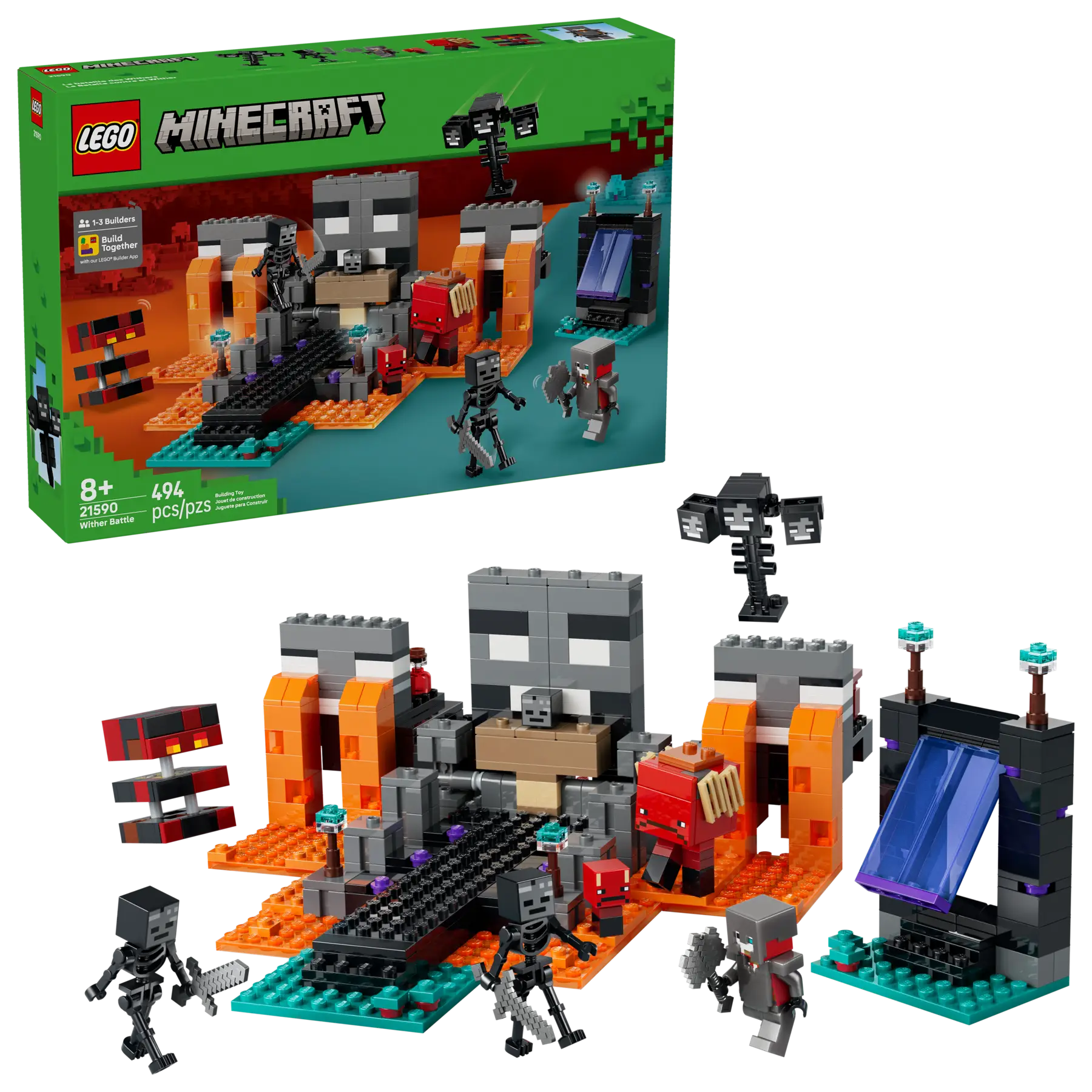 Transport Minecraft® players to endless pretend play possibilities with the Wither Battle (21590) building toy for boys and girls 8 years old and up. Kids join the Crimson Warrior as he takes on 2 skeletons and other mob figures in an explosive adventure in the warped forest biome. Packed with action and authentic Minecraft details, this set includes gaming characters like a Crimson Warrior, 2 wither skeletons, a strider, a magma cube and a buildable wither boss. A Nether portal and a shrine with a crafting table and a hidden wither that kids can summon with an explosion feature bring the game to life. Kids enjoy imaginative, hands-on play as they battle foes, ride the strider and engage in epic adventures – making it a great gamer gift for Minecraft players, LEGO builders and fans of video game toys. And friends and family can team up with Build Together mode in the LEGO Builder app, where everyone has fun building part of the set using their own devices. Set contains 494 pieces.