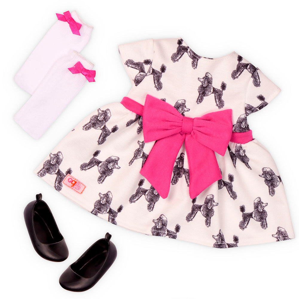 This 46cm doll has a huggable soft body and lifelike features to delight doll fans during playtime. Her beautiful hazel eyes open and close, and her long, light-brown hair is fun to style in many ways! Kids can care for Gemma's adorable pup with fun play pieces like a grooming brush, treats, and a leash that really clips to the collar! She wears a Poodle-print dress with a large pink bow waist, a dog bone hair clip, and a Poodle charm bracelet. When it's time for dress-up, her outfit has easy-open closures to quickly put on and remove. So you can mix, match, and create even more stylish looks!
