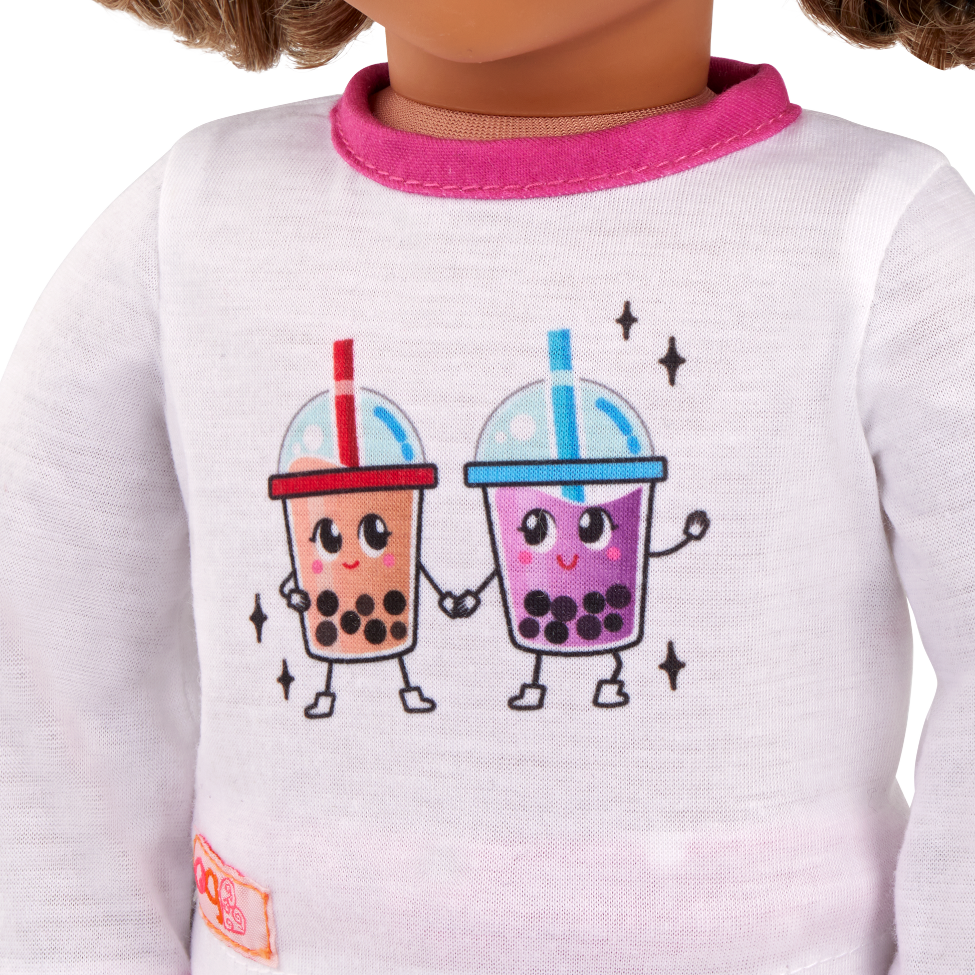 Get your favorite 18-inch doll bestie ready for tea-rrific slumber parties with the Our Generation Best Teas outfit! This cute clothing set includes a graphic pajama top with bubble tea best friends and bright pink bottoms, making it a fun go-to outfit for bedtime and sleepovers. Plus, it also comes with a plush bubble tea pillow for added giggles and storytelling. When it's time for dress-up, this 18-inch doll outfit has easy-open closures to quickly put on and remove. So kids can mix, match, and create more stylish looks as they explore imagination and self-expression. Our Generation 18-inch doll clothes make a great gift for kids ages 3+ (small parts), encouraging them to create their own unique stories. Compatible with most 18-inch dolls and doll clothes. Our Generation dolls sold separately.