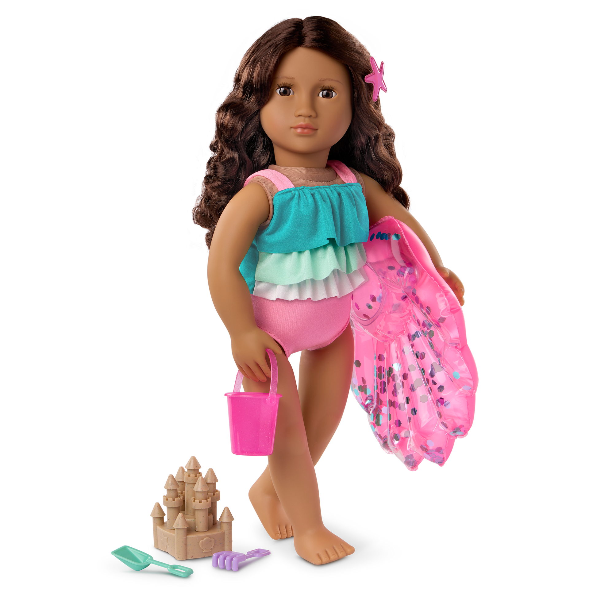 Dive into magical adventures with the Our Generation Mermaid Dreams set for 18-inch dolls! Turn your favorite doll bestie into a mermaid with the ruffle swim top and shimmery mermaid tail. Then, use the starfish hair deco to complete their marvelous look. It sticks to their doll's hair for easy styling! A glittery seashell pool float that really inflates adds to the storytelling. And themed accessories like a detailed sandcastle with beach toys let kids take the fun ashore. This Our Generation doll clothing set is filled with oceans of playtime possibilities. Compatible with most 18-inch dolls and accessories. Makes a great gift for kids ages 3+ (small parts), encouraging them to create their own unique stories. Our Generation dolls sold separately.
