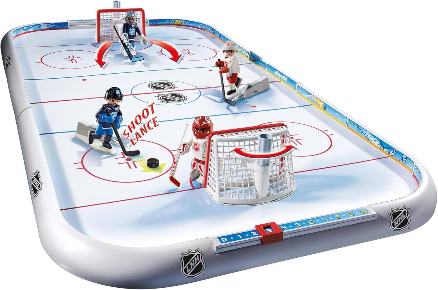 Skate into action with your own hockey match at the NHL Hockey Arena. Each of the four NHL players feature a movable arm and hockey stick for even more realistic game play. Simply pull back the lever to swing the stick and fire the puck down the rink towards the opposing goal. Use the goalie to defend against offensive plays by clipping the player to the goal and then using the joystick to maneuver the goalie from side to side for some game-saving blocks! Thanks to the included team decals, kids can customize each player to represent their favorite NHL team. Set includes four NHL players (two per team), three hockey pucks, game play rules booklet, player number decals, logo decals for all 30 NHL teams, score-keeping slide rule, and other game-tastic accessories. Recommended for ages five and up.