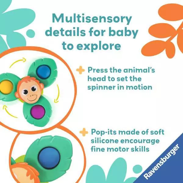 Your baby will have lots of fun with this colourful spinner. Simply press the animal’s head to send the leaves spinning. Featuring bright pop-its made of 100% silicone, this fidget spinner is perfect for keeping baby busy – during playtime, mealtime and changing time. Whether at home or on-the-go, the practical suction cup lets you stick the spinner on any smooth surface.