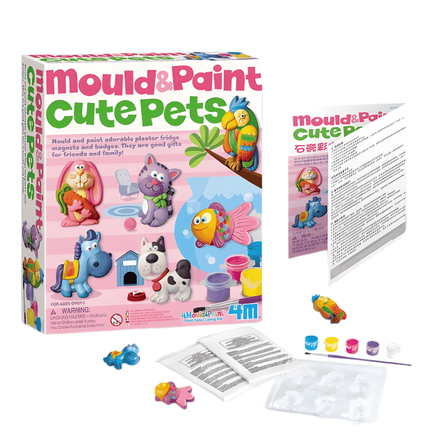 4M MOULD AND PAINT CUTE PETS Mould and paint adorable plaster fridge magnets and badges. They are great gifts for friends and family! Contains everything needed including: mould with 6 designs, magnet, pins, 6 colour paint strip, paint brush and detailed instructions for making 6 cute pets.