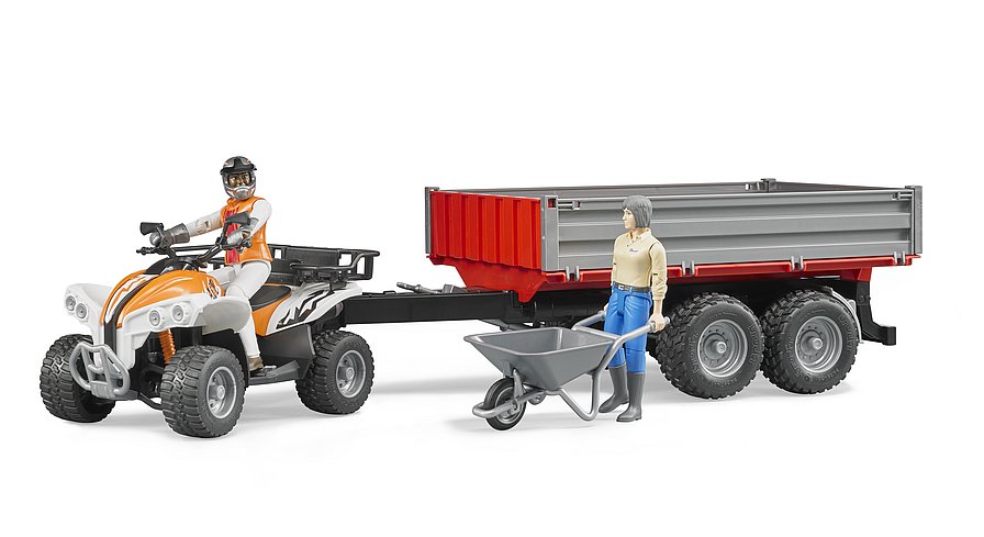 A quad combines the fun of a motorcycle with the flexibility of an off-road vehicle. Little wonder then that quads are used in forestry, agriculture, on construction sites or for recreational use, and are becoming more and more popular. The BRUDER quad has a very modern and high-quality design, leaving a lasting impression on or off the road. The suspension of both axles and the steerability of the front axle make the quad very versatile and allows pinpoint manoeuvres even in difficult terrain. The quad is also ideal as a commercial vehicle thanks to its removable luggage rack, trailer coupling and tool holders. The vehicle together with the bworld figure could hardly be any more realistic. The impression you get of the figure with his helmet and modern protective vest complements the off-road racing feel. The firm grip on the handlebars and a driver?s seat that has been opti-mised for a sporty posture mean the driver stays in control even when speeding over impassable terrain. A sta-ble bullbar and good road-holding tyres complete the picture.