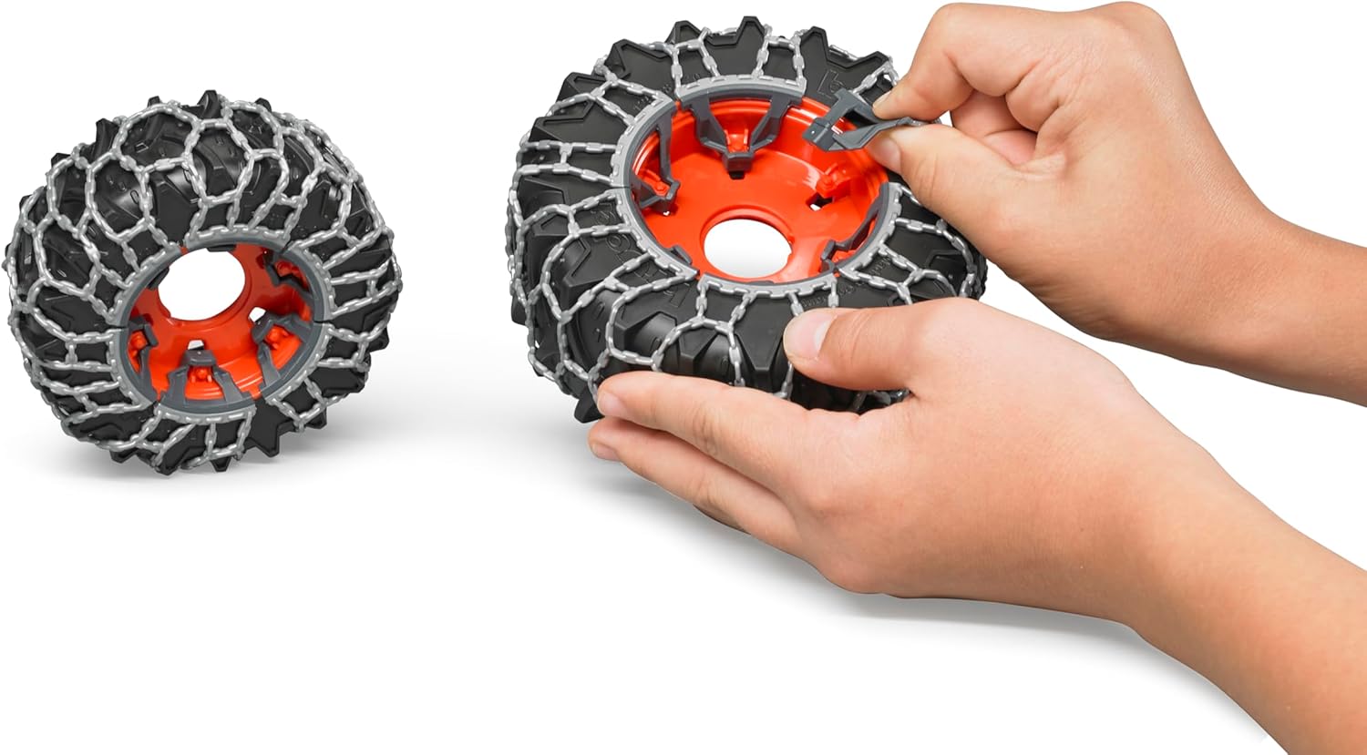 Winter can come! The Axion 950 offers comprehensive innovations in function, usability and performance. In combination with the BRUDER snow chains for extra grip on ice and snow and the height-adjustable and pivoting snow plow, even large masses of snow on the roads can be easily cleared. For a realistic playing experience, the driver's cabin is fully glazed and doors and the bonnet can be opened. The steering extension makes it easy to control the tractor from outside. The adjustable rear coupling means that all trailers in the Profi series can be combined.
