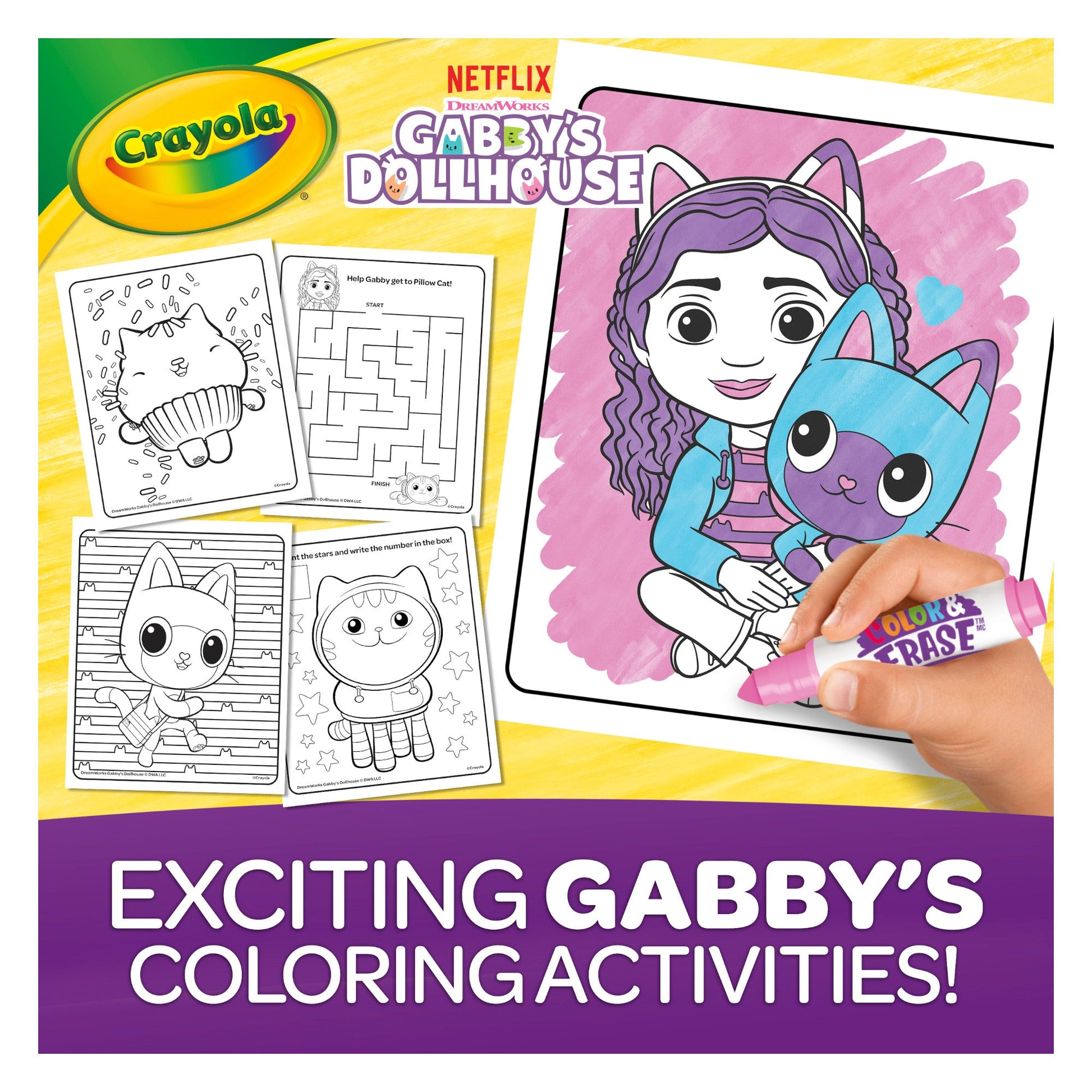CRAYOLA GABBY'S DOLLHOUSE ACTIVITY PAD: Features 12 Dual-Sided 6” x 8” Reusable Colouring Activity Pages, 4 Colour & Erase Washable Markers, and 6 Reusable Sticker Sheets including over 100 Reusable Stickers.
