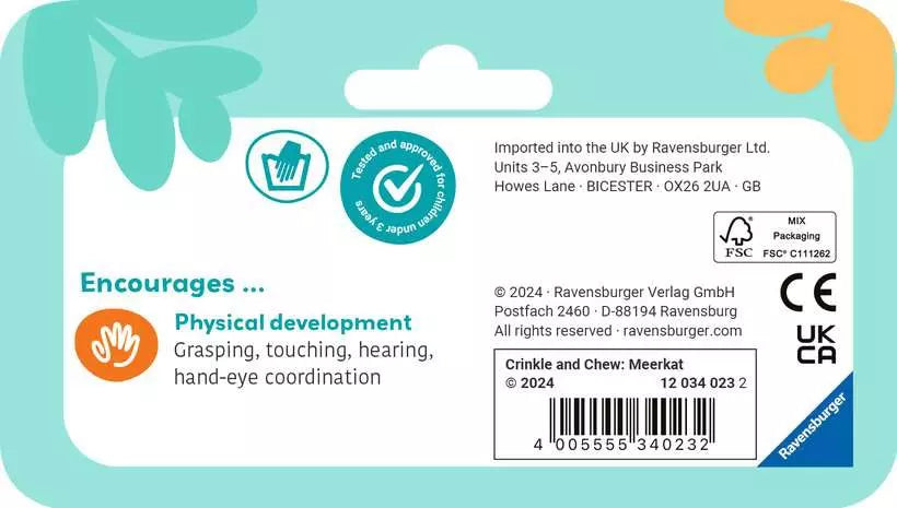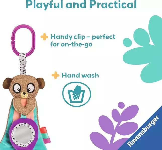 This loveable meerkat activity toy will entertain baby while on the go. Multisensory details will keep little fingers busy, while the bright, silicone teething edge will help to soothe sore gums. Baby will love to hear the crinkle effects as they explore the bright colourful ribbons, fuzzy fabrics and knots. Who’s that in the mirror? It’s me! Baby will be captivated by reflections in the little mirror. Crinkle & Chew Meerkat is great for anytime play, and the handy clip makes it easy to take the fun along wherever you go!