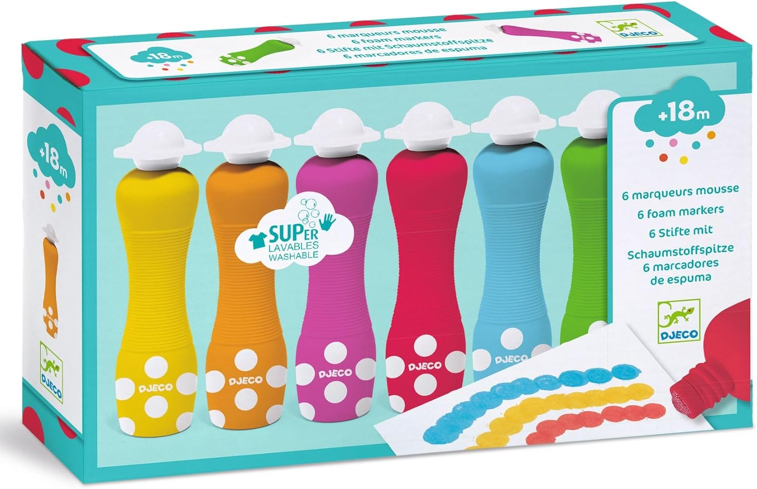 Stamping and drawing in one, you can do that with this fun set of foam pens from Djeco. 6 tubes of washable foam marker colours for little hands. Start artistic skills and sensory play from an early age with this colourful set. The bright foam markers making it easy for young artists to get started. Little ones can color their coloring page in an original way or can use it freely.