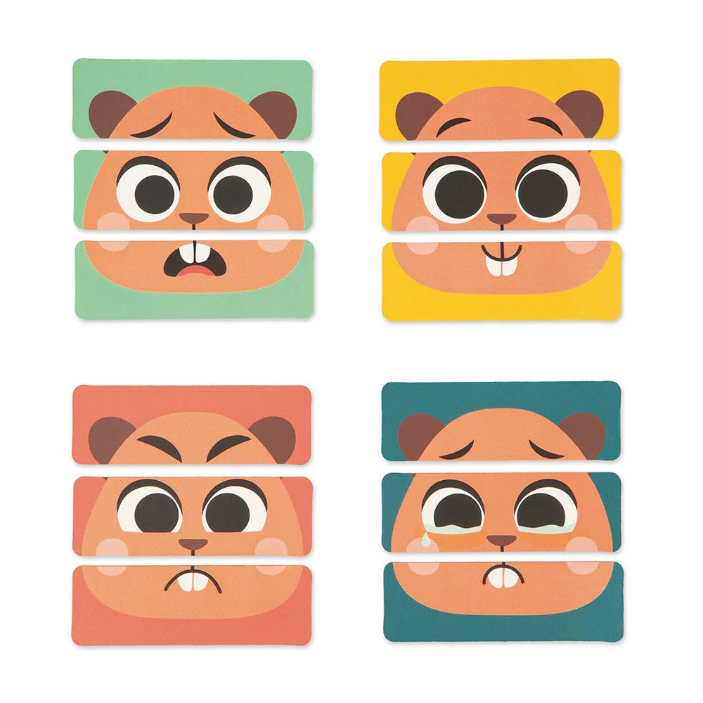 - Last but not least is the emotion-themed wooden puzzle: our beaver friend returns and prompts children to expand their vocabulary and better identify emotions. 4 emotions are represented (joy, sadness, fear and anger) and have a distinctive coloured background which serves as a guide for your little one.