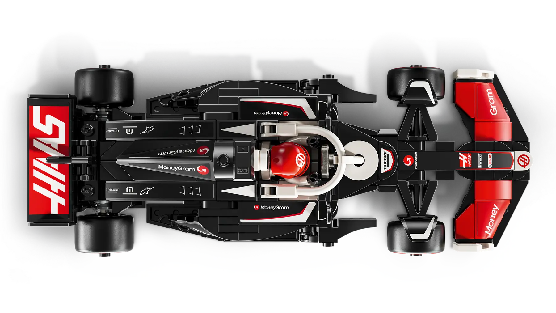 - Authentic MoneyGram Haas F1® Team details – F1 model car with details from the real-life 2024 version, including a halo bar, rear wing, sponsor stickers and wider rear tires imprinted with “Pirelli”
