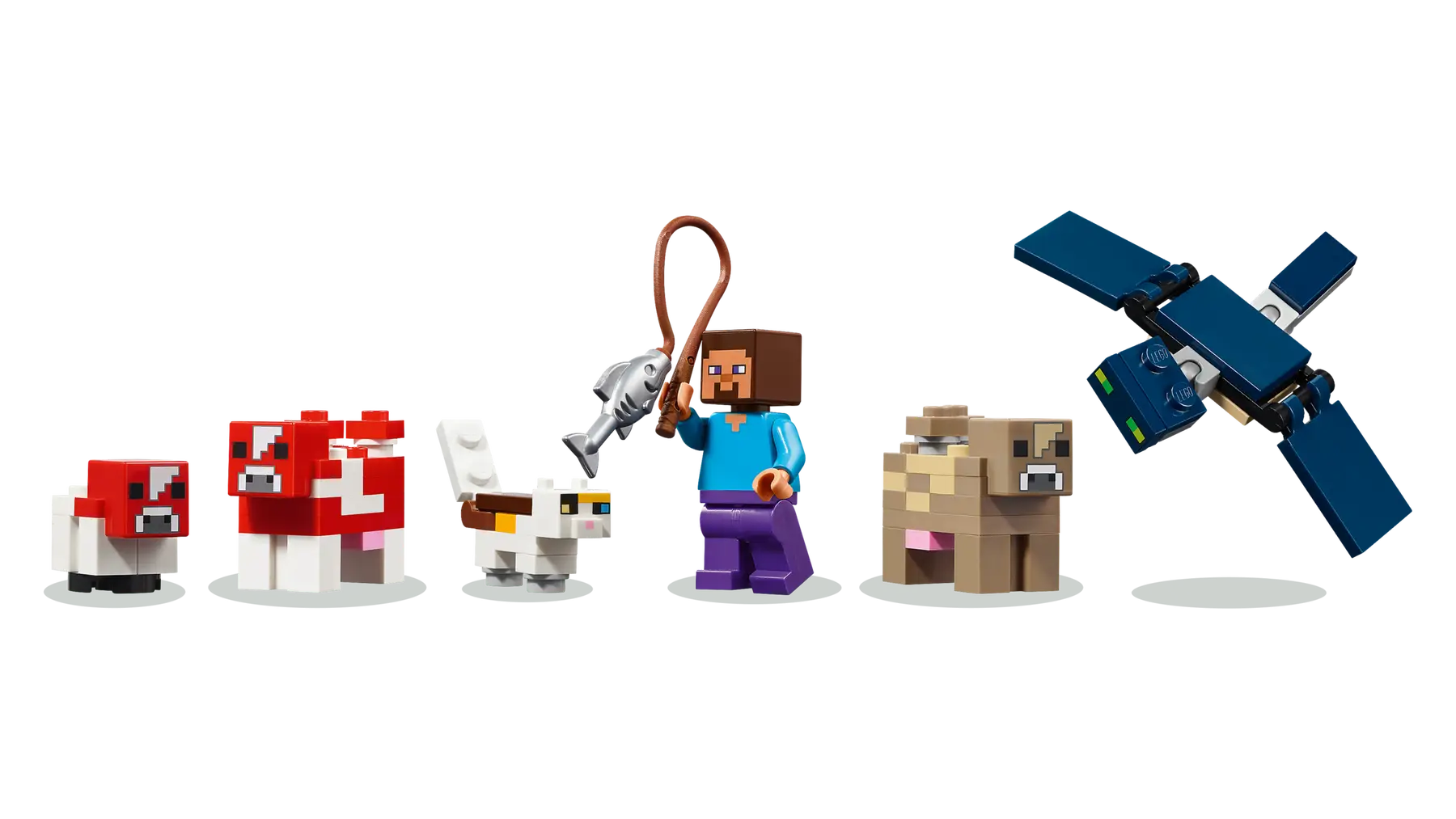 - Hands-on video game toy – Kids build a large, mooshroom-shaped house with a small farm on an island, go fishing in a boat and search for treasure