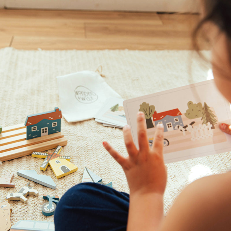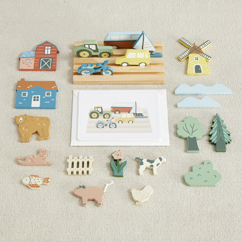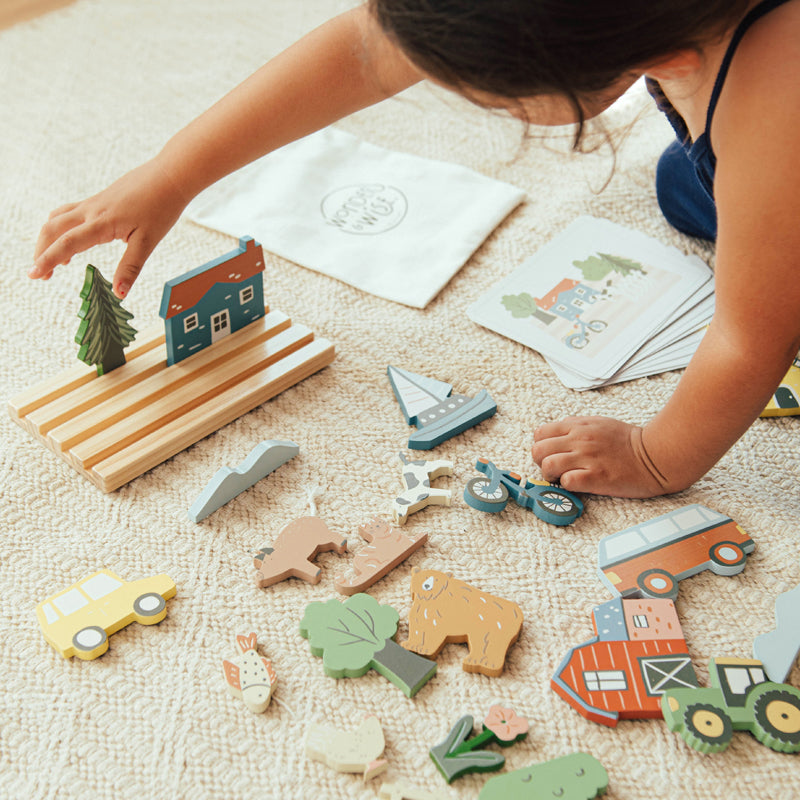 Our My Town Picture Matching Game is a great and fun way to help your kiddos learn placement and sequencing by matching the wooden objects to the pictures. Our high-quality set includes a chunky wooden base that holds 21 assorted vehicles, trees, houses, bikes and more. 12 cardboard pictures with scenes to match. Learning has never been so much fun!