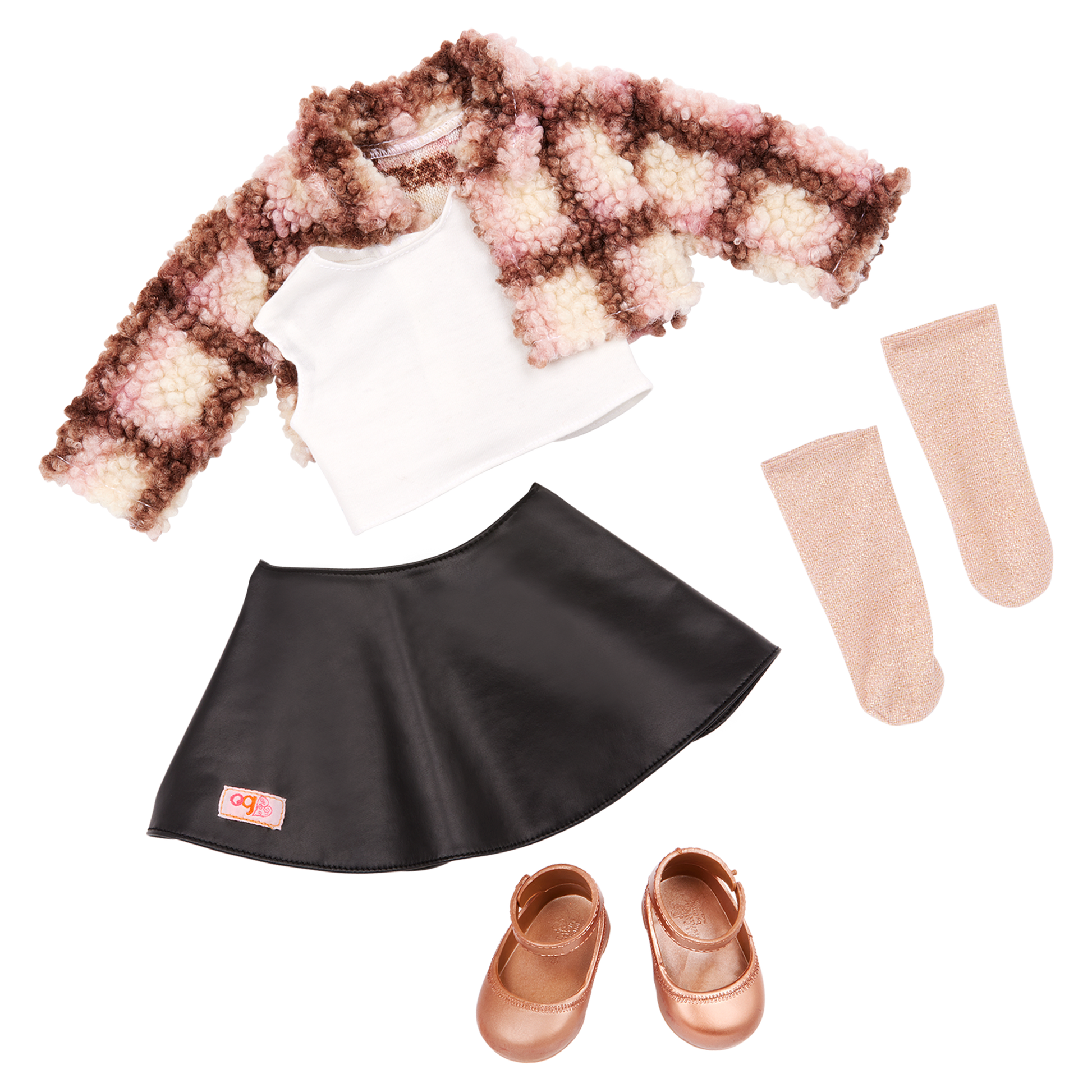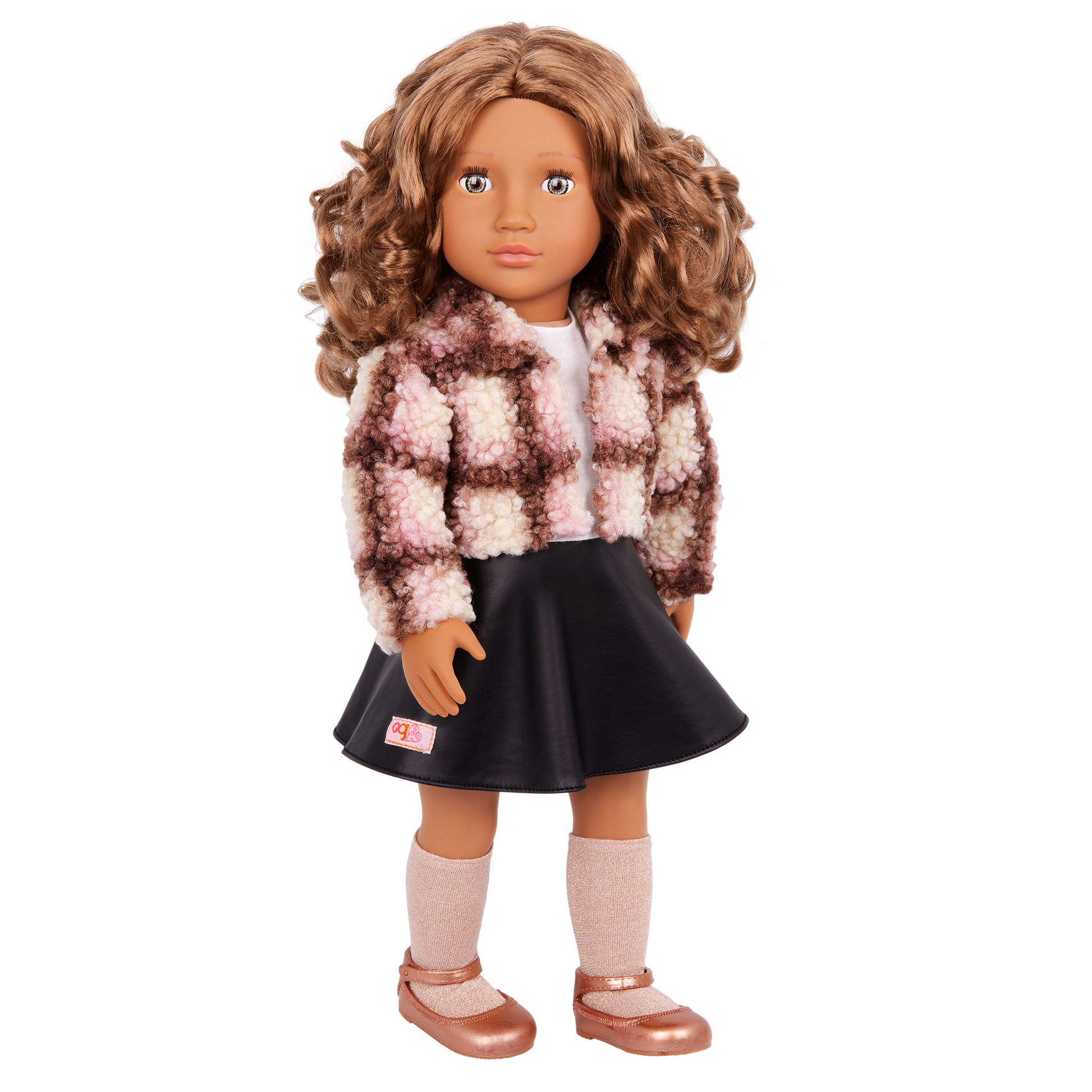 A pop of plaid and plenty of friendship fun! Our Generation 18-inch doll Ana has a huggable soft body and lifelike features that will delight doll fans during playtime. Her beautiful hazel eyes open and close, and her curly, light-brown hair is fun to style in many ways! A cute combination between a shirt and a jacket, Ana wears a cozy "shacket" made of soft faux shearling, a leatherette skirt, a casual top, tall socks, and shoes for a complete outdoorsy look. When it's time for dress-up, her outfit has easy-open closures to quickly put on and remove. So you can mix, match, and create even more styles on any adventure! Our Generation dolls make a great gift for kids ages 3+ (small parts), encouraging them to imagine their own unique stories.