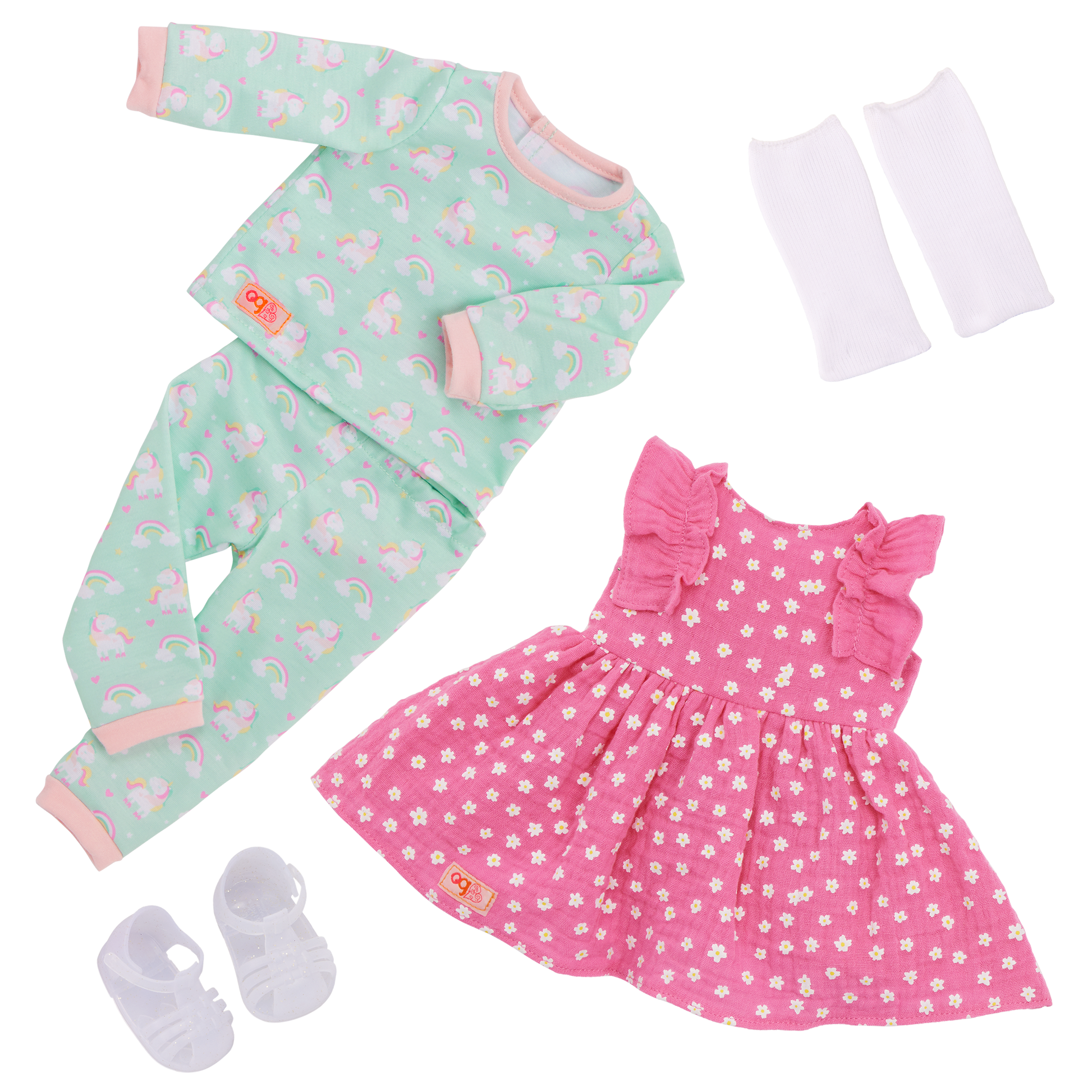 Explore double the dress-up fun with Our Generation 18-inch doll Gillian! She wears a cute pink dress decorated with mini florals and comes with a bonus rainbow pajama! Themed accessories like a hair scrunchie, rainbow pillow, tall socks, a bowl of cereal, and a spoon add an extra fun touch to pretend slumber parties and bedtime storytelling. Gillian also has a huggable soft body and lifelike features that will delight doll fans during playtime. Her wavy blonde hair is fun to style, and her beautiful hazel eyes really close when it's time for sweet dreams! During dress-up, each outfit has easy-open closures to quickly put on and remove. So you can mix, match, and create even more stylish looks on any adventure! Our Generation dolls make a great gift for kids ages 3+ (small parts), encouraging them to imagine their own unique stories.