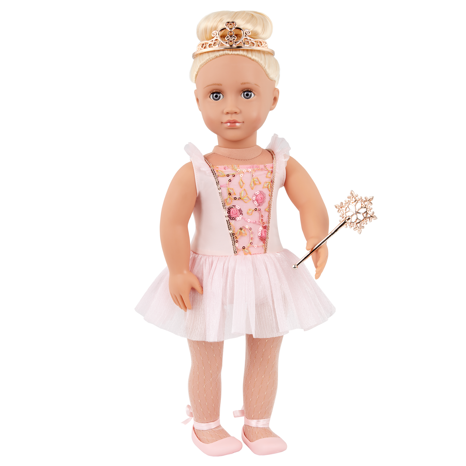 Enter the land of sweets and dream up magical adventures with Our Generation Sugar Plum Fairy Lalia! This enchanting 18-inch doll has lifelike blue eyes that open and close with long blonde hair that's fun to style. She has a huggable soft body and can rotate her neck, arms, and legs to move like a ballerina. Lalia arrives wearing a charming ballet dress with sequin details, a pair of tights, and pink ballet shoes. Plus, her wondrous look comes complete with signature accessories like a golden tiara and a snowflake-themed wand! Lalia's outfit also has easy-open closures for kids to quickly put on and remove. So they can mix, match, and create more cute combos. Our Generation dolls make a great gift for kids ages 3+ (small parts), encouraging them to imagine their own unique stories.