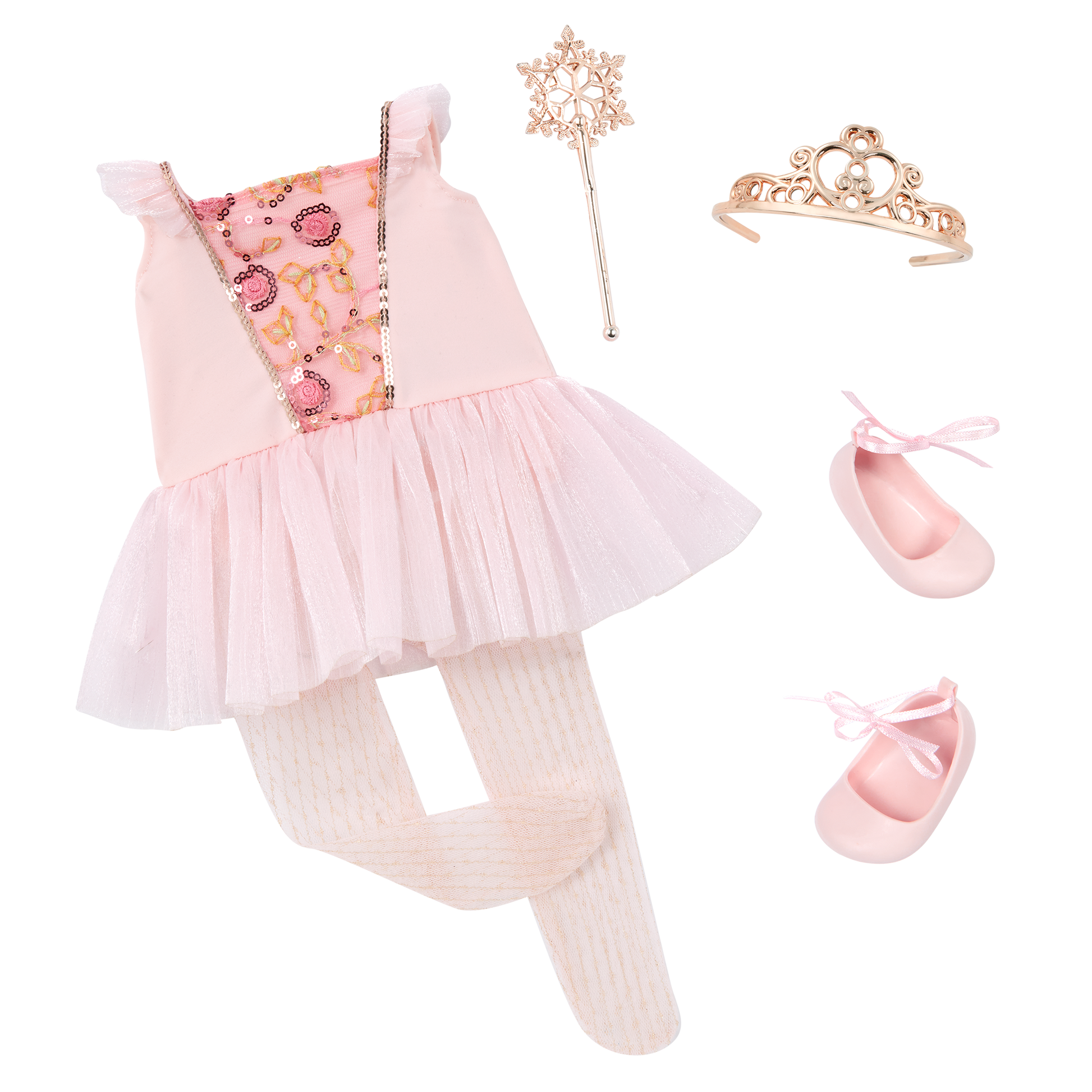 - Enchanting Style: Lalia arrives with a charming ballet dress decorated in sequin details, a golden tiara, a snowflake-themed wand, a pair of tights, and ballet shoes.
