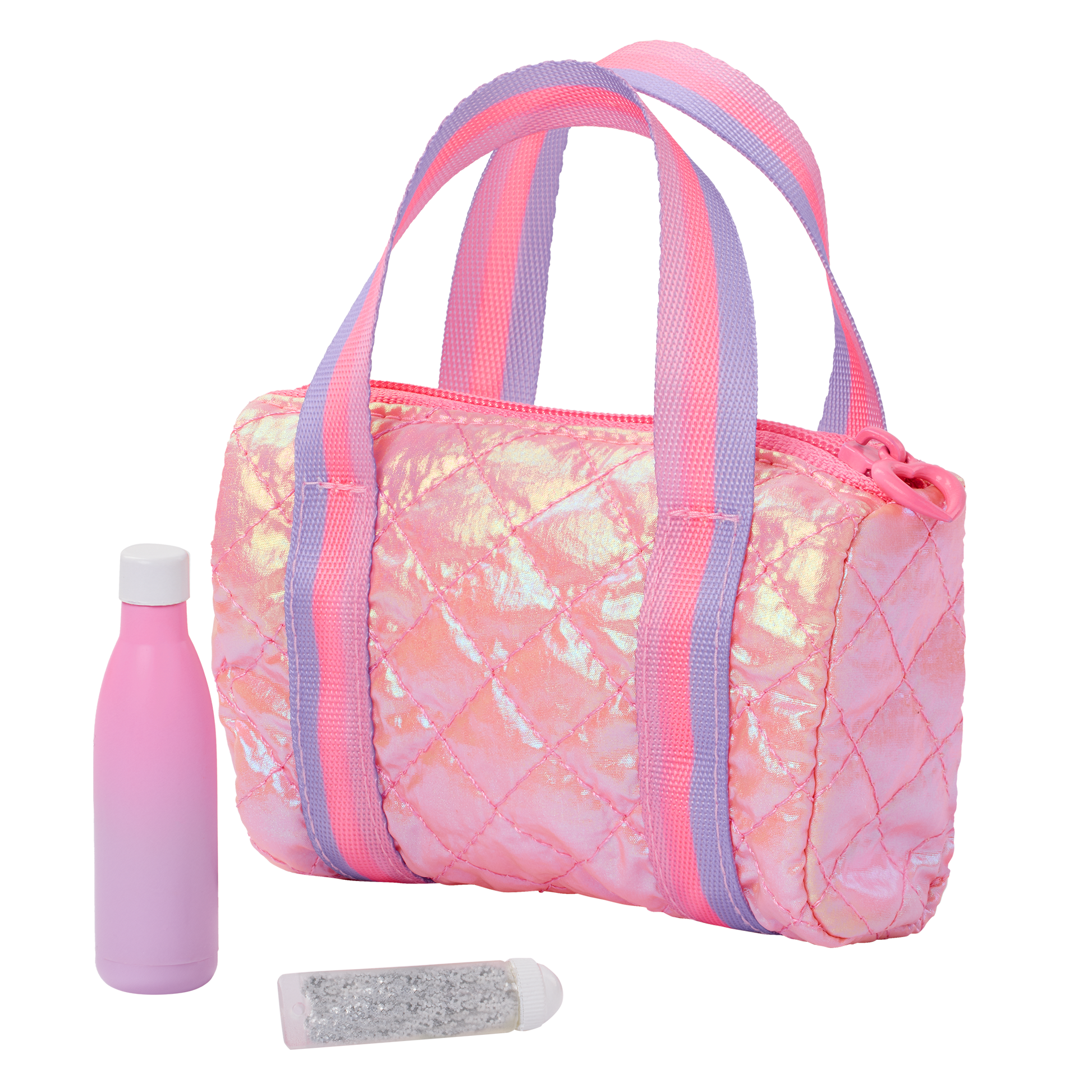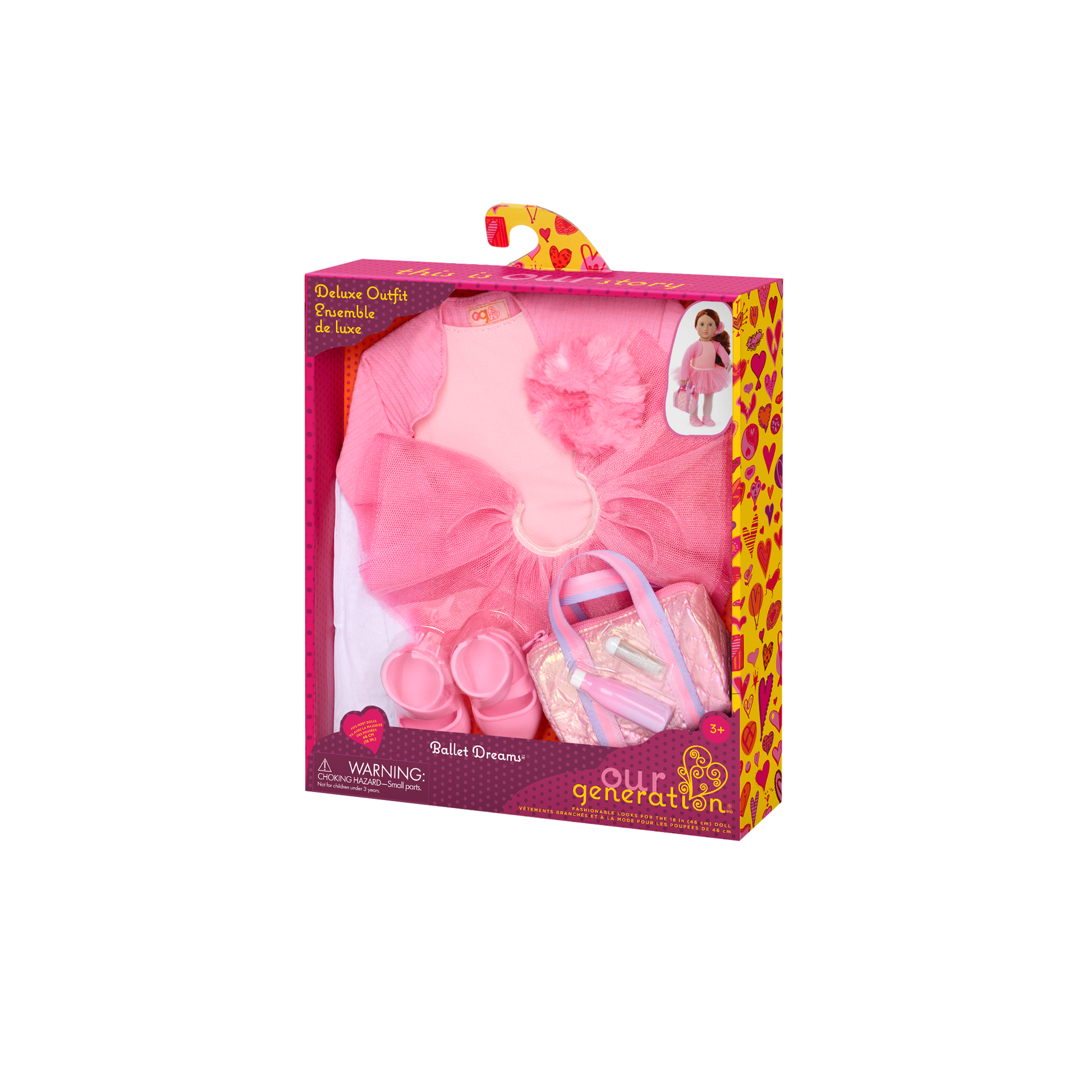 Shine in the spotlight with the Our Generation Ballet Dreams outfit for 18-inch dolls! Designed in sweet shades of pink, the leotard, tulle skirt, and ballet pointe shoes let little ballerinas twirl in style. Plus, the warm-up shrug has thumb holes in the sleeves that fit around Our Generation doll's thumbs! Themed accessories like a hair scrunchie, water bottle, and lip gloss add to the storytelling. And the dance bag zips open to take playtime from the practice studio to center stage! This Our Generation doll clothing set makes a great gift for kids ages 3+ (small parts), encouraging them to create their own unique stories. Compatible with most 18-inch dolls, doll clothes, and accessories. Our Generation dolls sold separately.