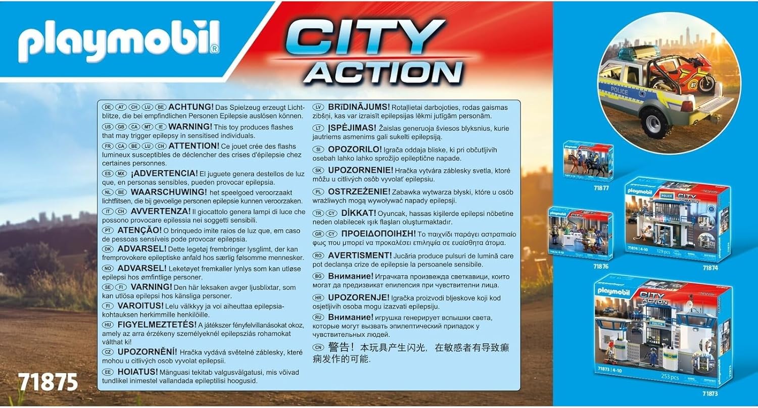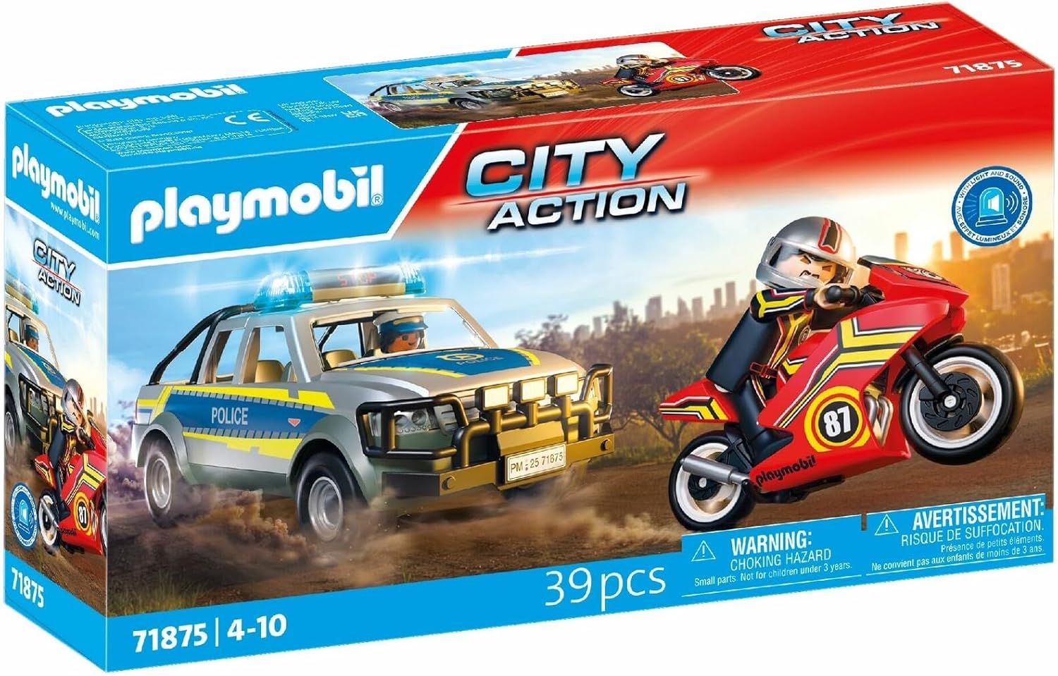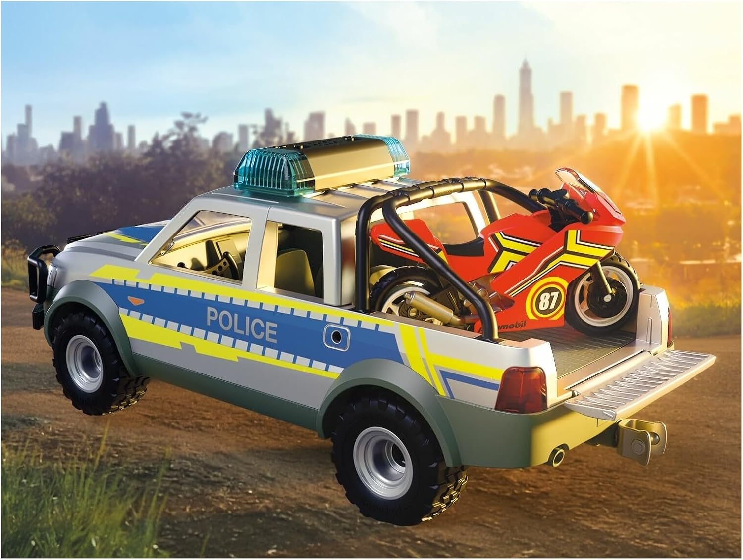 1. Set up the police pick-up and motorcycle. 2. Place the police officer figure in the pick-up and the crook figure on the motorcycle. 3. Act out a chase scene, using the blue light and siren functions on the pick-up. 4. Try to catch the crook on the motorcycle. 5. Once caught, transport the motorcycle to the police station using the pick-up's loading area.