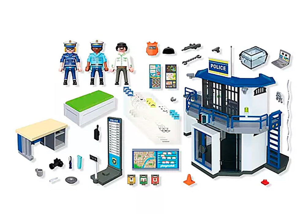 - Figures: 1 policeman, 1 policewoman, 1 criminal; Accessories: 1 police station, 1 table, 1 transparent box with lid, 1 mugshot wall, 1 camera, 1 bed with mattress, 1 table, 1 chair, 1 plate, 1 cup, 1 spoon, 1 toothbrush with toothpaste, 1 sink, 1 mirror, 1 toilet, 2 police caps, 1 rifle, 2 pistols, 1 key ring, 1 investigation wall with 15 transparent sheets, 2 traffic cones