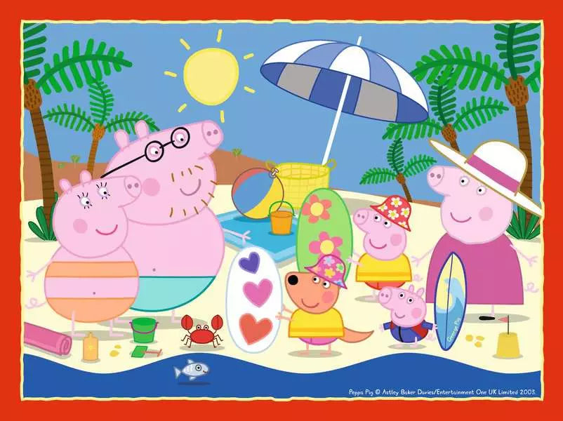 Piece together 4 bright and colourful images of Peppa Pig and friends enjoying lot of fun days out. Piece together Peppa Pig, George Pig, Suzy Sheep, Rebecca Rabbit, Emily Elephant, Danny Dog, Candy Cat, Pedro Pony, Richard Rabbit, Freddy Fox playing at the park , or join Peppa, George, mummy and daddy pig at a picnic or at the beach, or piece together Peppa, George, Emily Elephant and Mr Elephant at Potato City. Our 4 in a box kids puzzles are crafted with premium quality and measure 19 x 14cm when complete. Great puzzles for Children 3 years old and up.