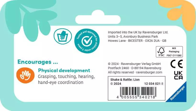 This colourful lion activity toy will keep baby entertained whilst on the go. Multisensory details will keep little fingers busy, and high-contrast colours offer engaging visual stimulation. Baby will love to shake the friendly lion to hear rattle sounds, and the bright ribbons or soft mane of this friendly lion are fun too.