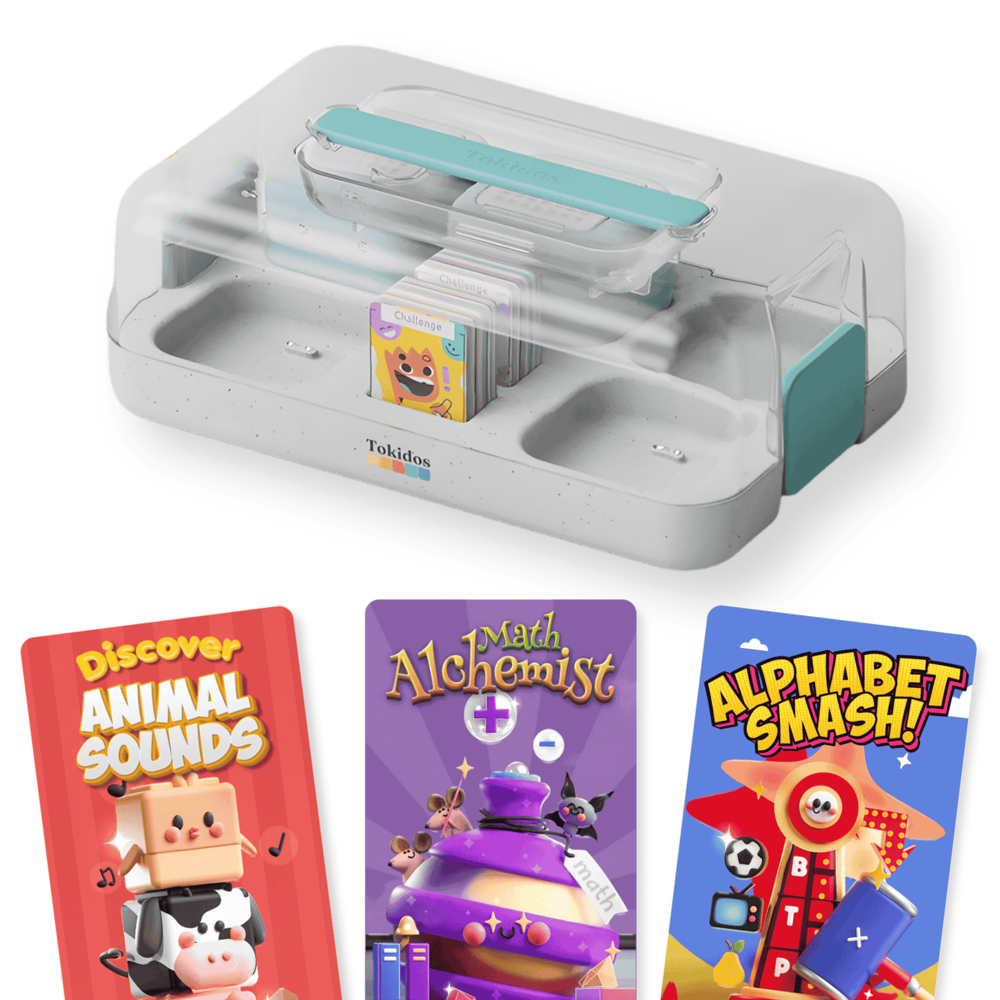 Your bundle includes the PlayCubes system, protective carry box, charging cable, and three exciting PlayCards: Discover Animal Sounds, Alphabet Smash, and Math Alchemist.