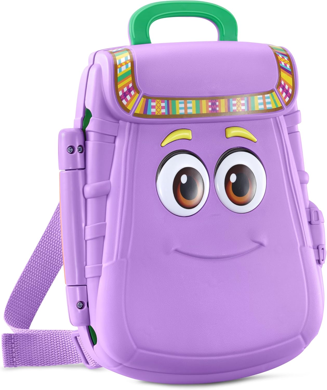 Pretend to go exploring with Dora and open Backpack to discover 12 interactive games and quizzes that help encourage key learning milestones in English and Spanish. The backlit screen and Map-shaped stylus help improve drawing and writing skills. Follow along with the animations to explore shapes, emotions, letters, objects, numbers and words. Then swipe it all away by sliding Swiper down the drawing board. Use the straps to put Backpack on like a real backpack and take her on the go. Vamanos! Time to play. Intended for ages 3+ years. Requires 2 AA batteries. Batteries included for demo purposes only. New batteries recommended for regular use.